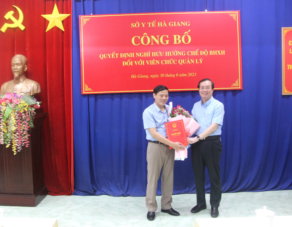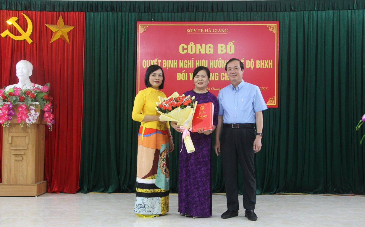Tại đây, đồng chí Hoàng Quốc Cứ, Phó Giám đốc Sở Y tế đã trao Quyết định cho đồng chí Nguyễn Thị Kiều Hồng, Phó Trưởng phòng Kế hoạch tài chính Sở Y tế nghỉ hưu hưởng chế độ BHXH theo quy định tại Nghị định 108/2014/NĐ-CP từ ngày 1/7/2023 và đồng chí Hoàng Tiến Việt, Hiệu Trưởng trường Trung cấp Y tế Hà Giang nghỉ hưu hưởng hưởng BHXH theo quy định từ ngày 1/7/2023.